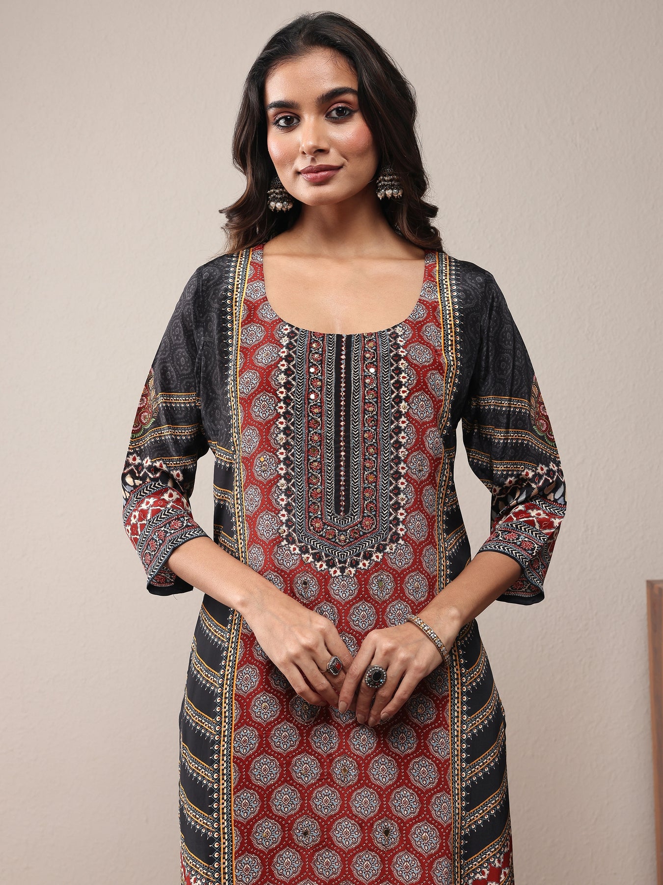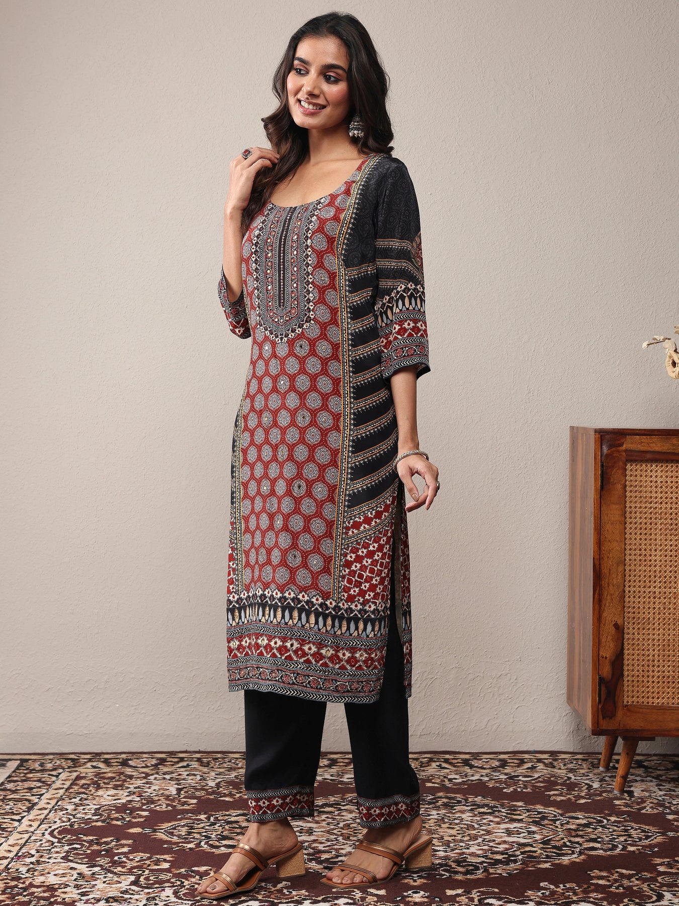 Our 3-piece Red and Black Muslin Kurta Set features a Straight-fit kurta with a Round Neckline, Regular Sleeves, and statement yoke. Complemented with Straight Pants with a Partially Elasticated waistband and 2 pockets, and a Printed dupatta. Adorned with ethnic motif printed, this style is perfect for Work Wear and Casual Wear.