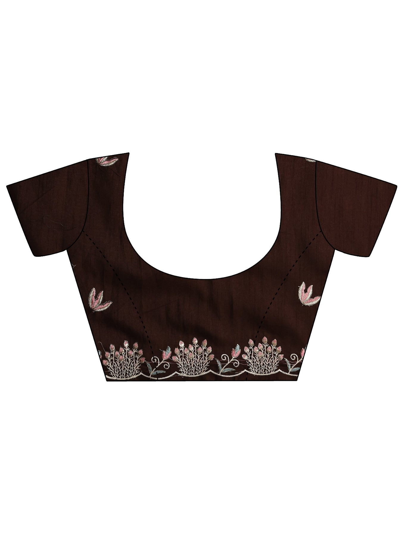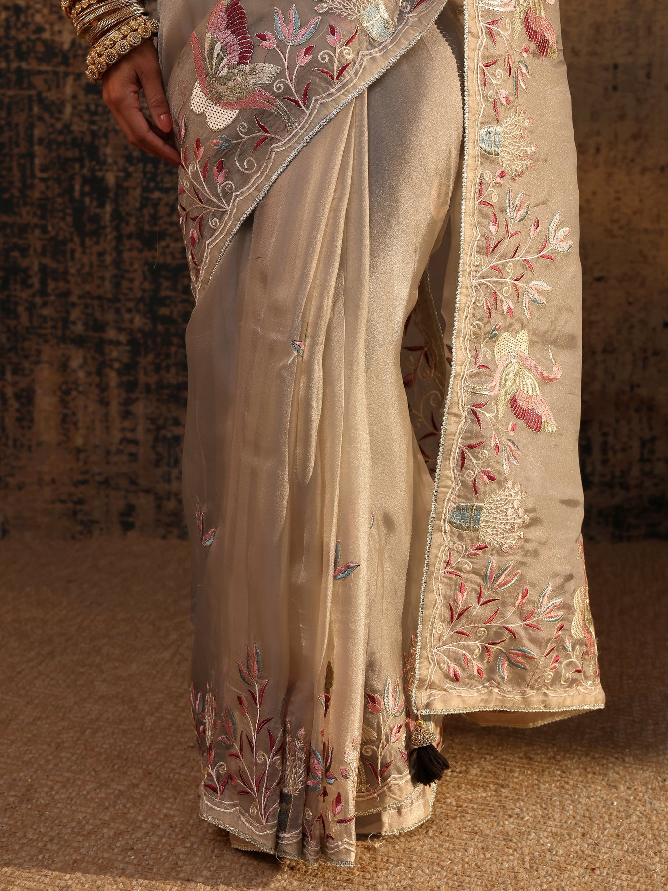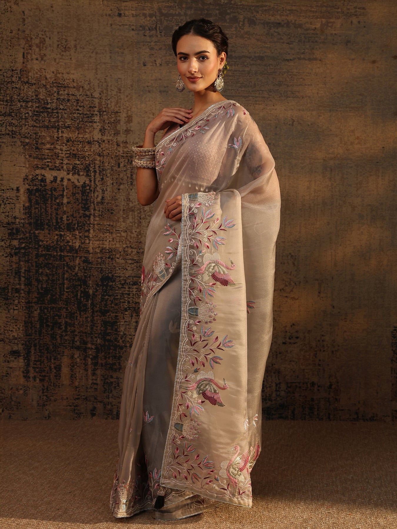 Taupe Floral Embroidered Organza Saree With Unstitched Blouse Piece