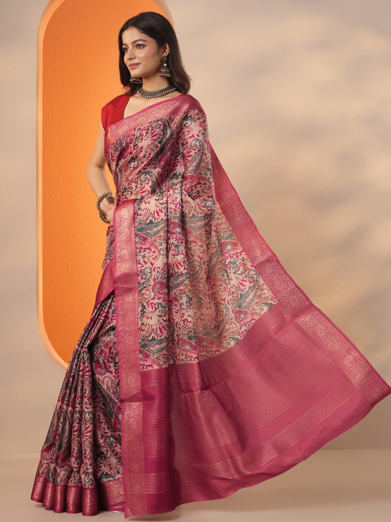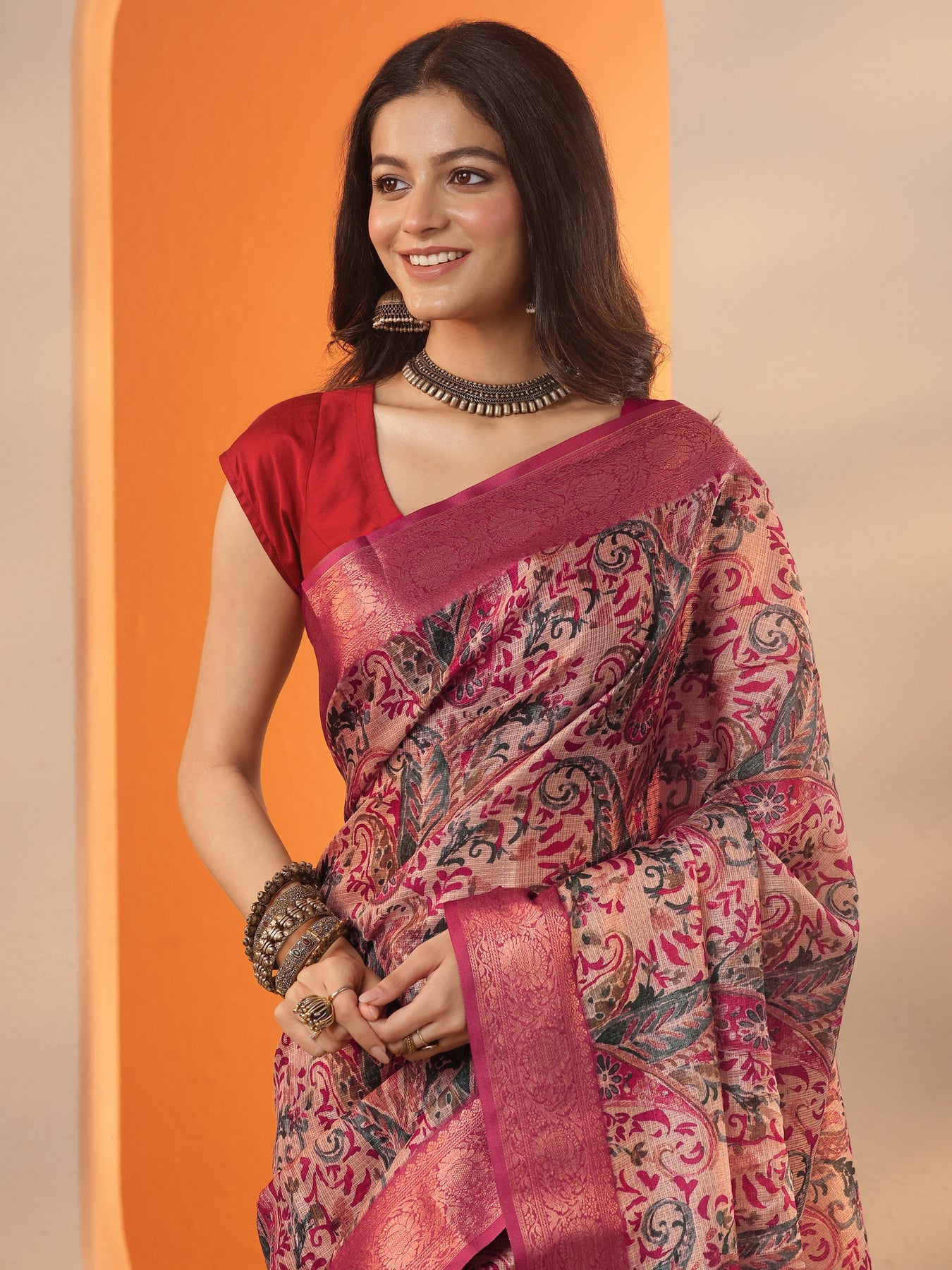 Taupe Printed Kota Saree With Unstitched Blouse Piece