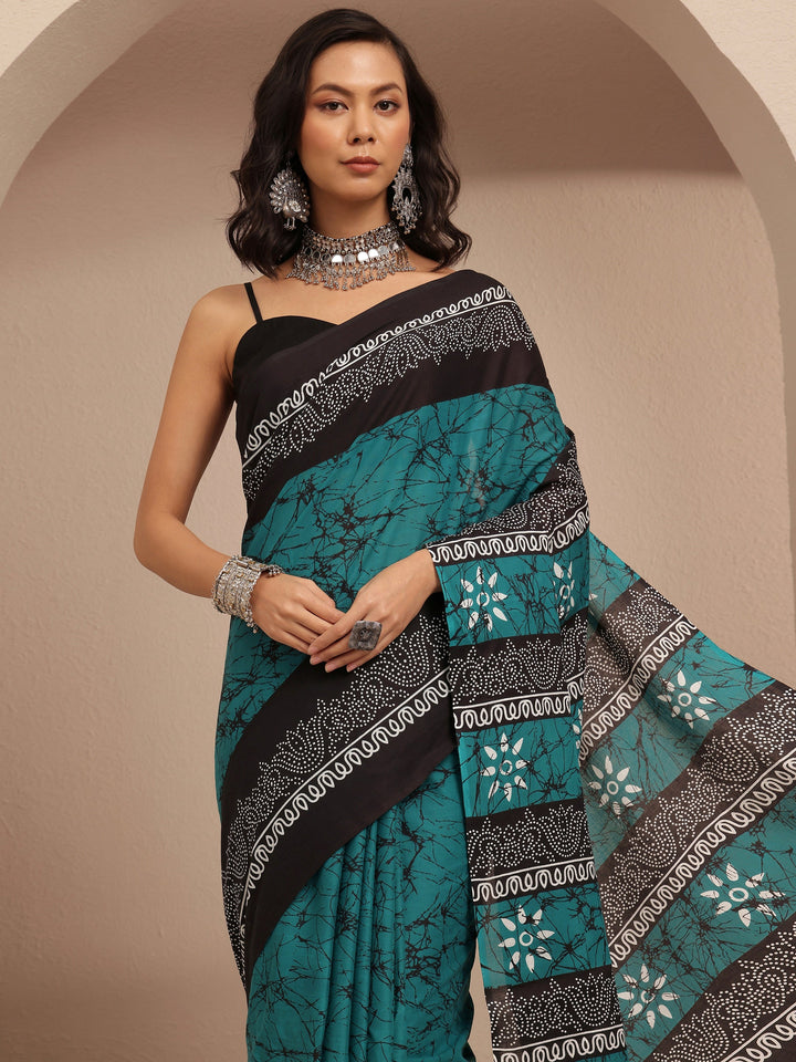 Teal Abstract Printed Cotton Saree With Unstitched Blouse Piece