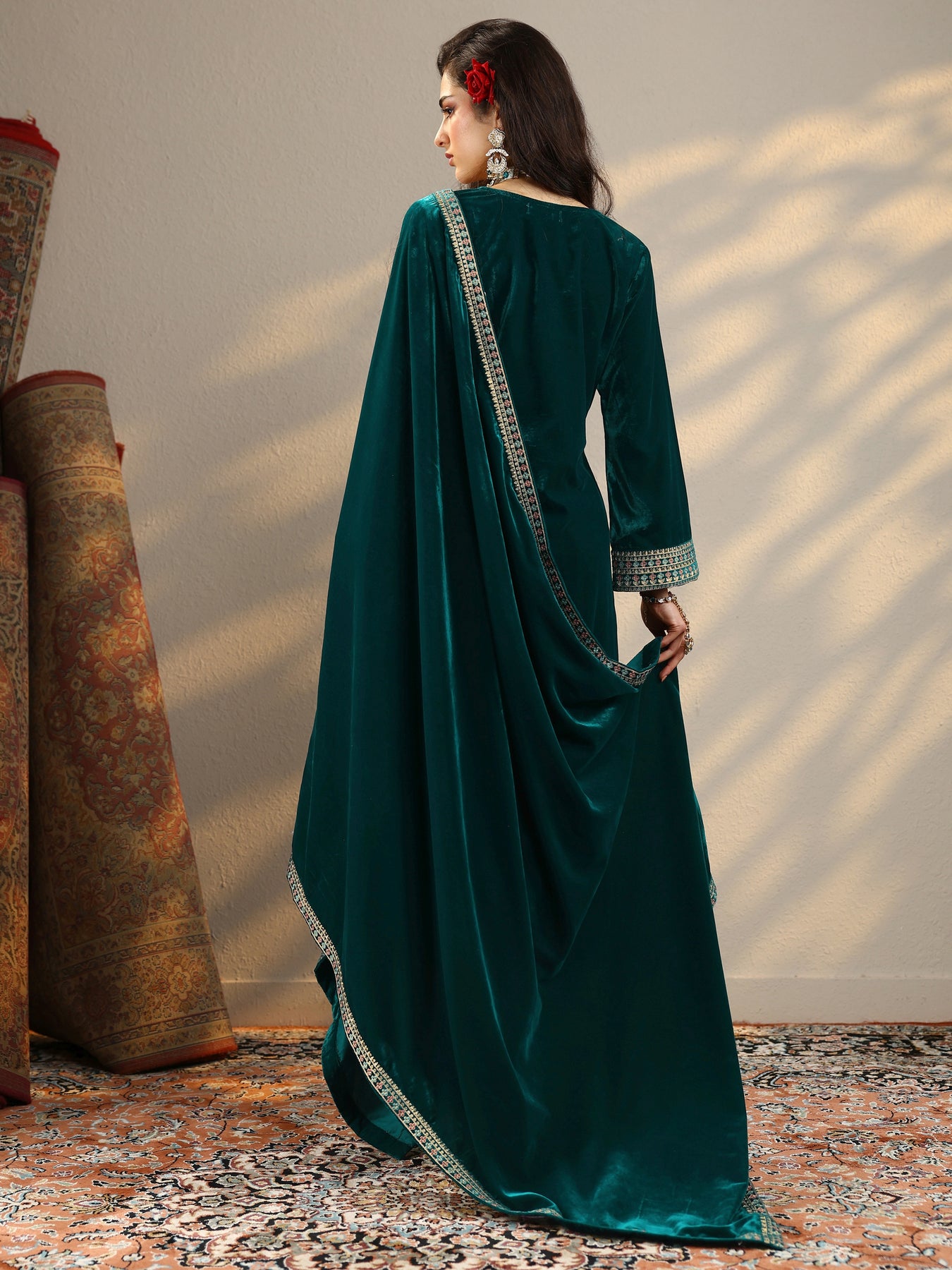 Amruta Teal Embroidered Velvet Straight Suit Set With Dupatta