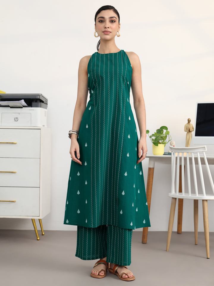 Teal Striped Woven Design Cotton Blend A-Line Kurta Set