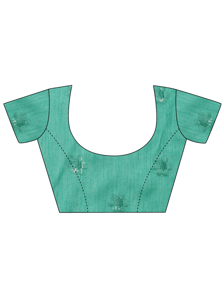 Our sea green printed organza saree features captivating floral print. Complemented with a blouse piece. This charming saree is perfect for festive occasions.