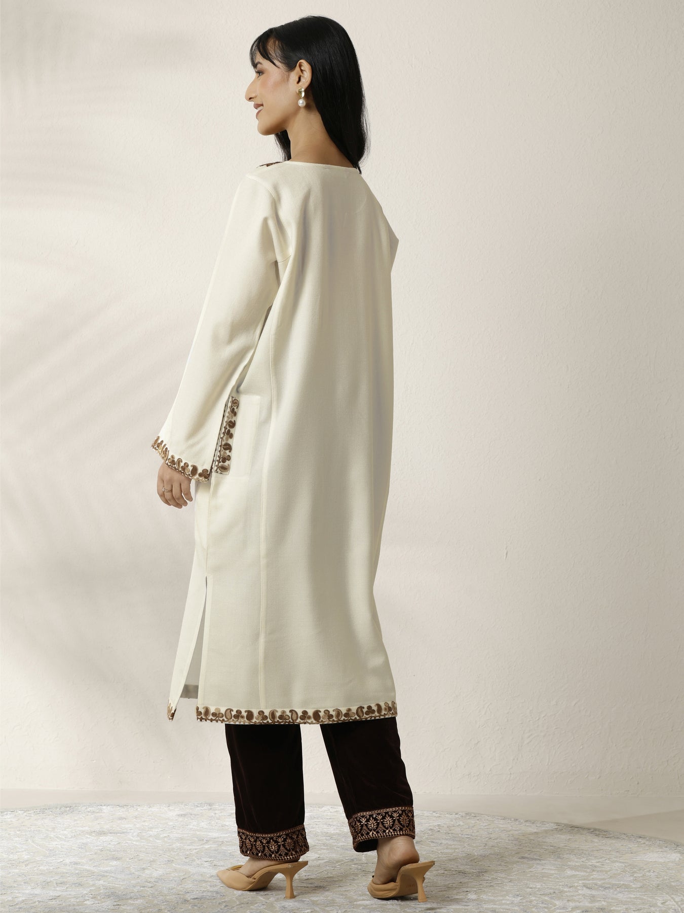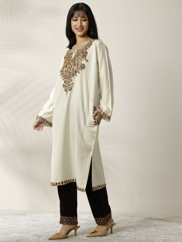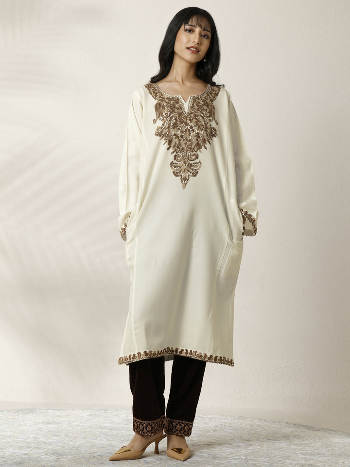 Our 1-piece off white wool straight-fit features a U-notched neckline, comfortable full sleeves, and statement Yoke. Adorned with floral embroidered, this style is perfect for festive occasions.