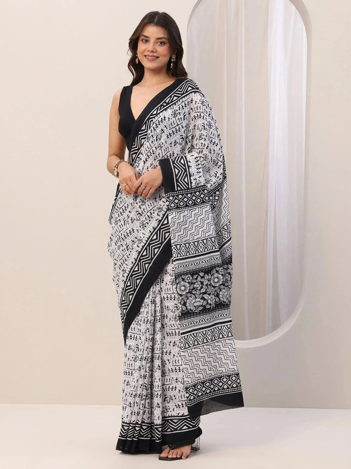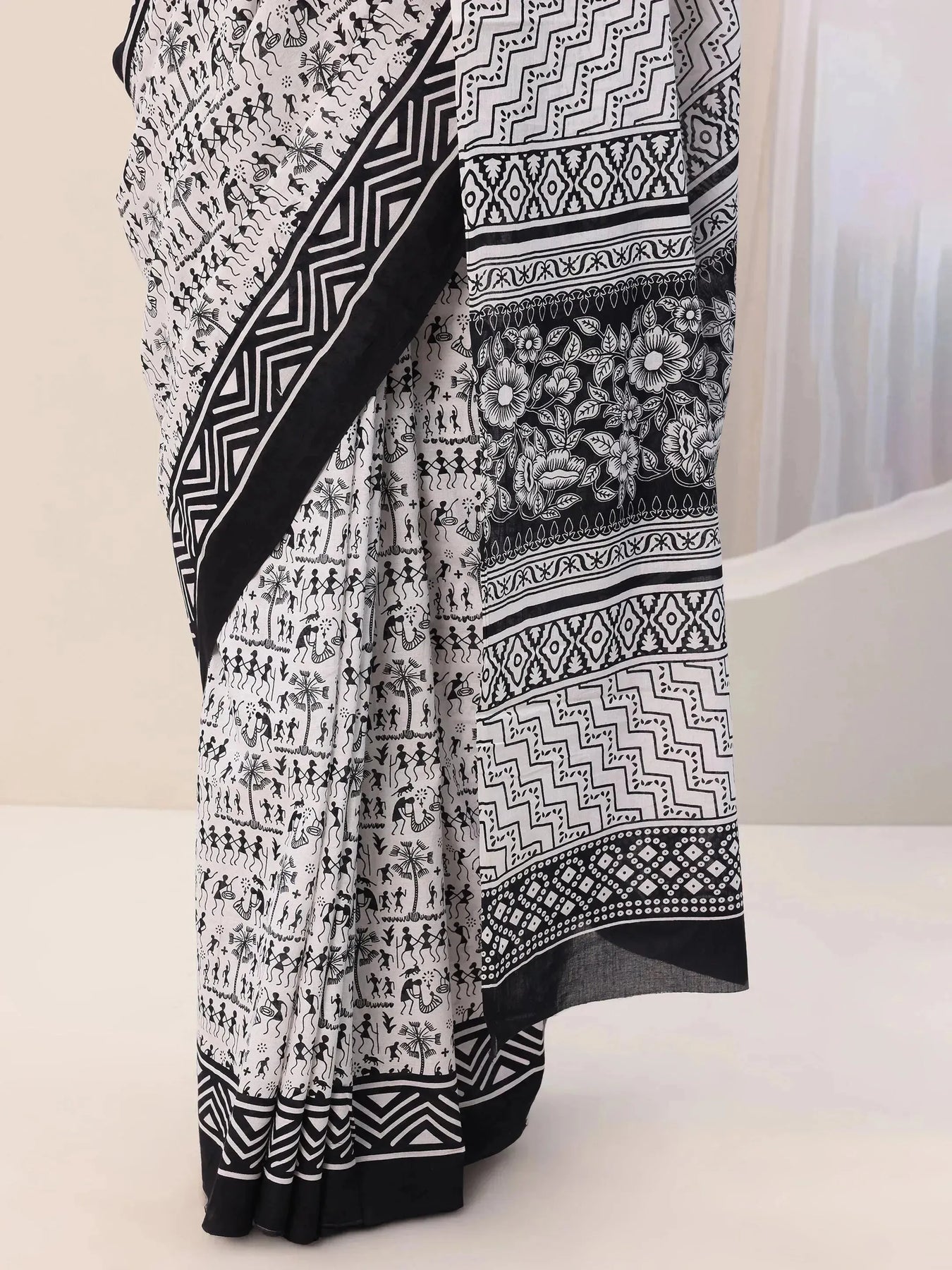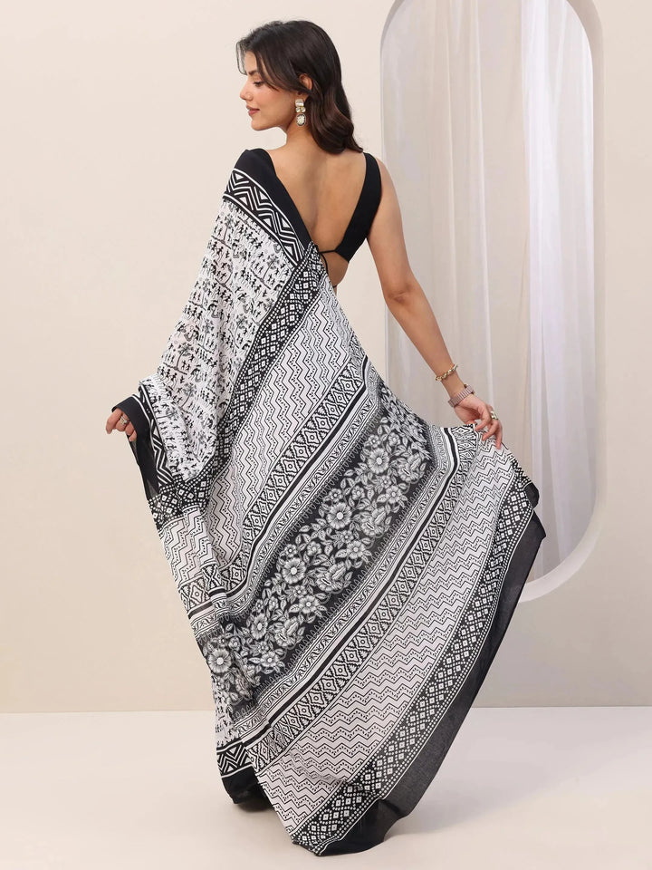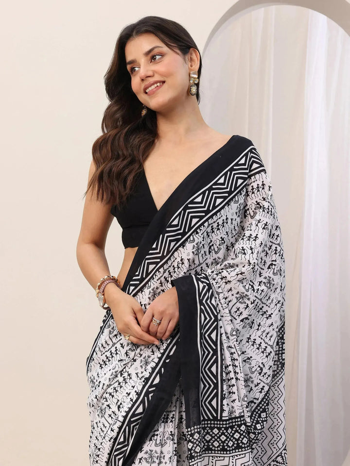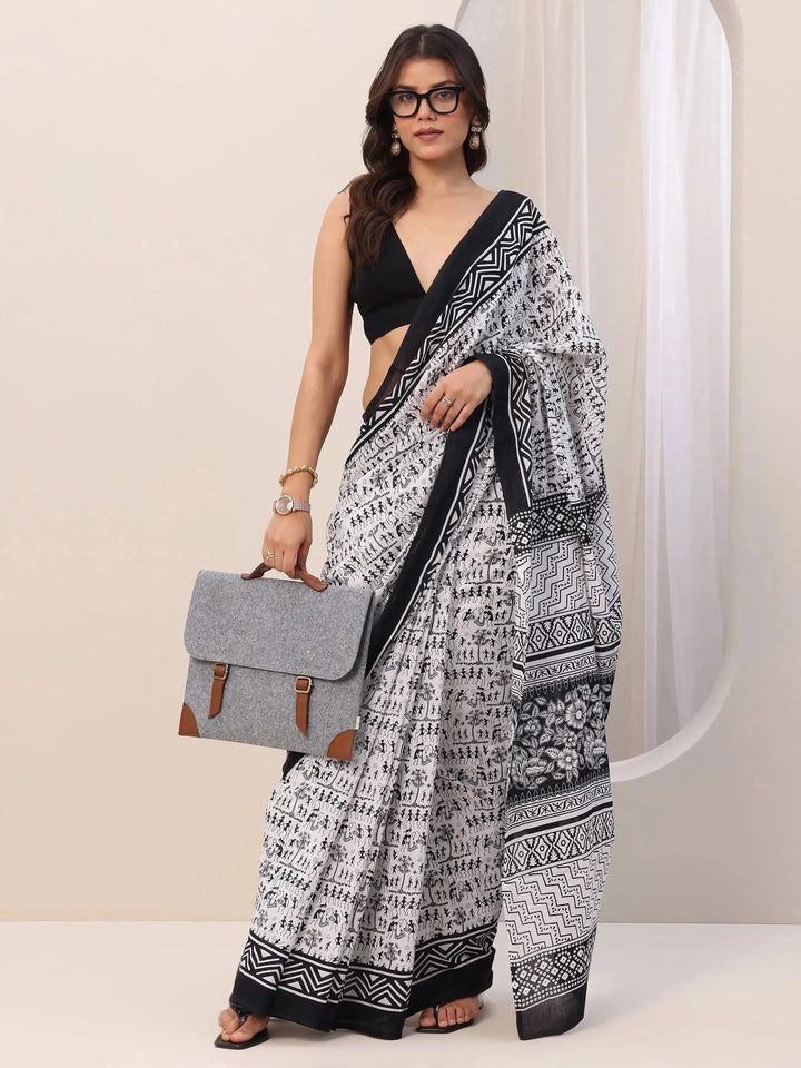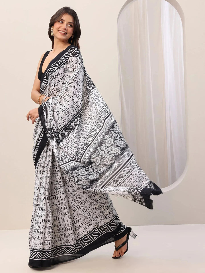 Our Black printed Cotton saree features captivating Tribal print. Complemented with a Blouse Piece. This charming saree is perfect for Casual occasions.