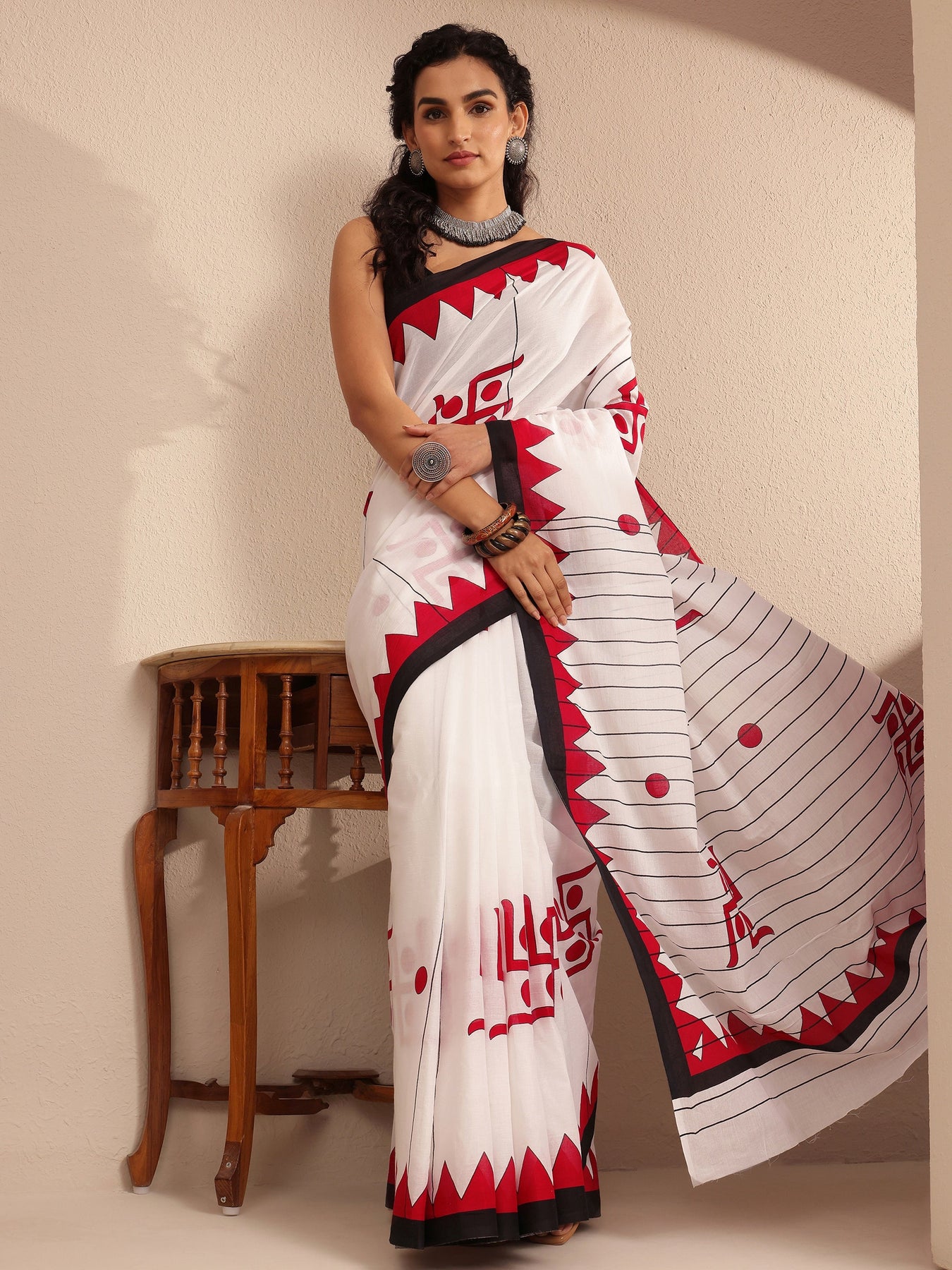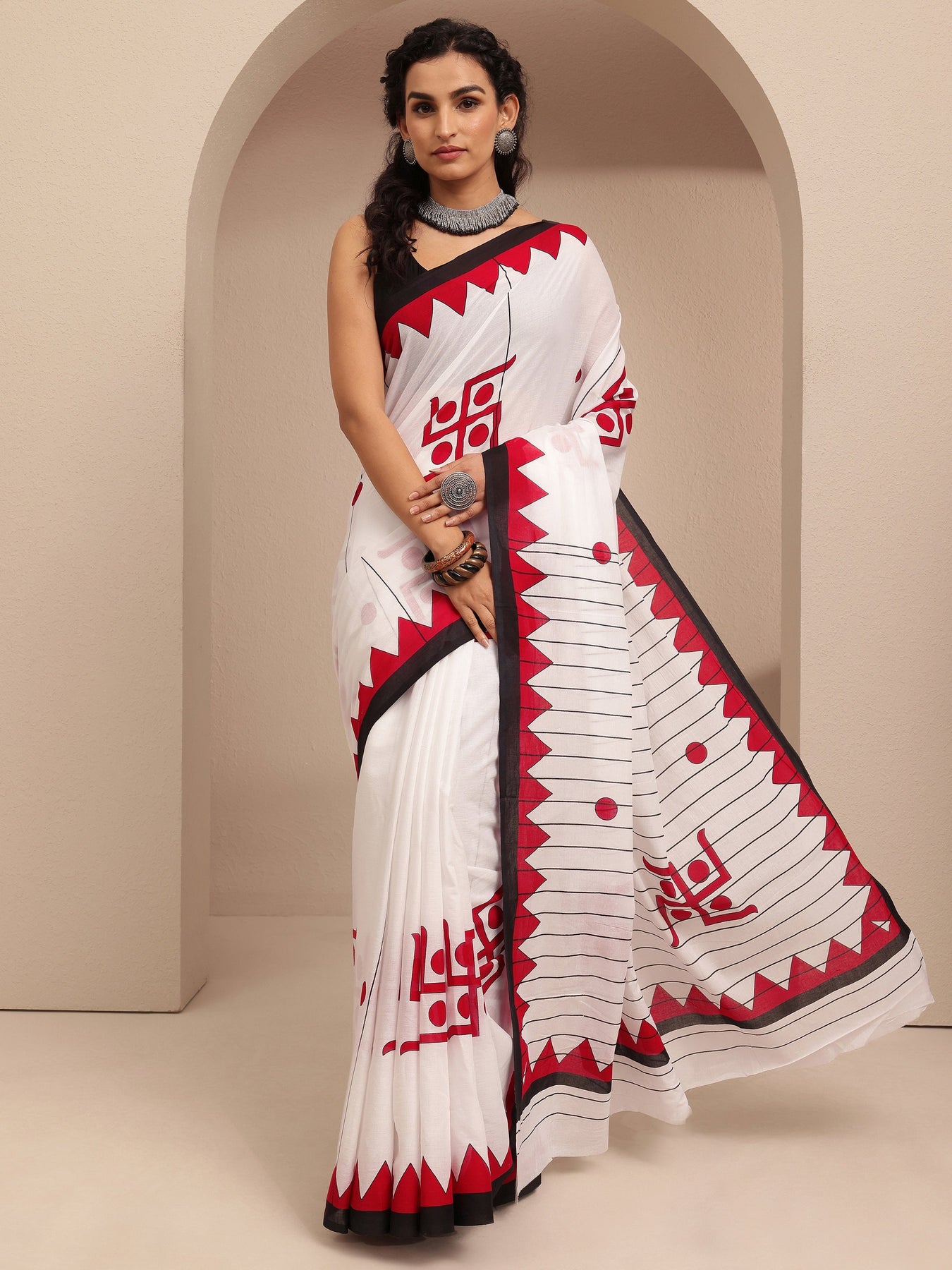 Our white printed cotton saree features captivating geometric print. Complemented with an unstitched Blouse Piece. This charming saree is perfect for festive occasions