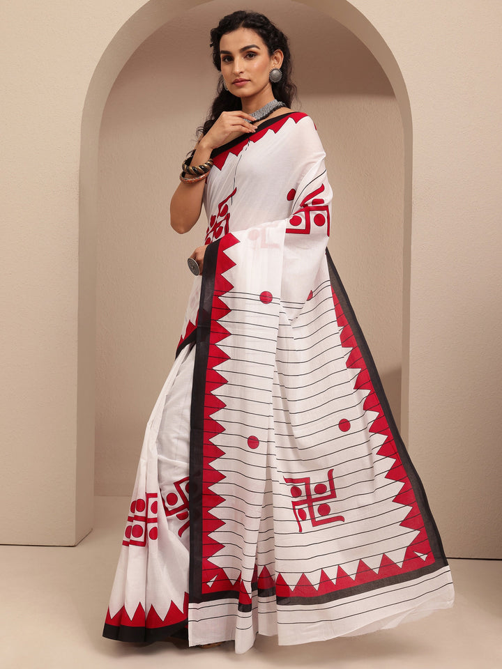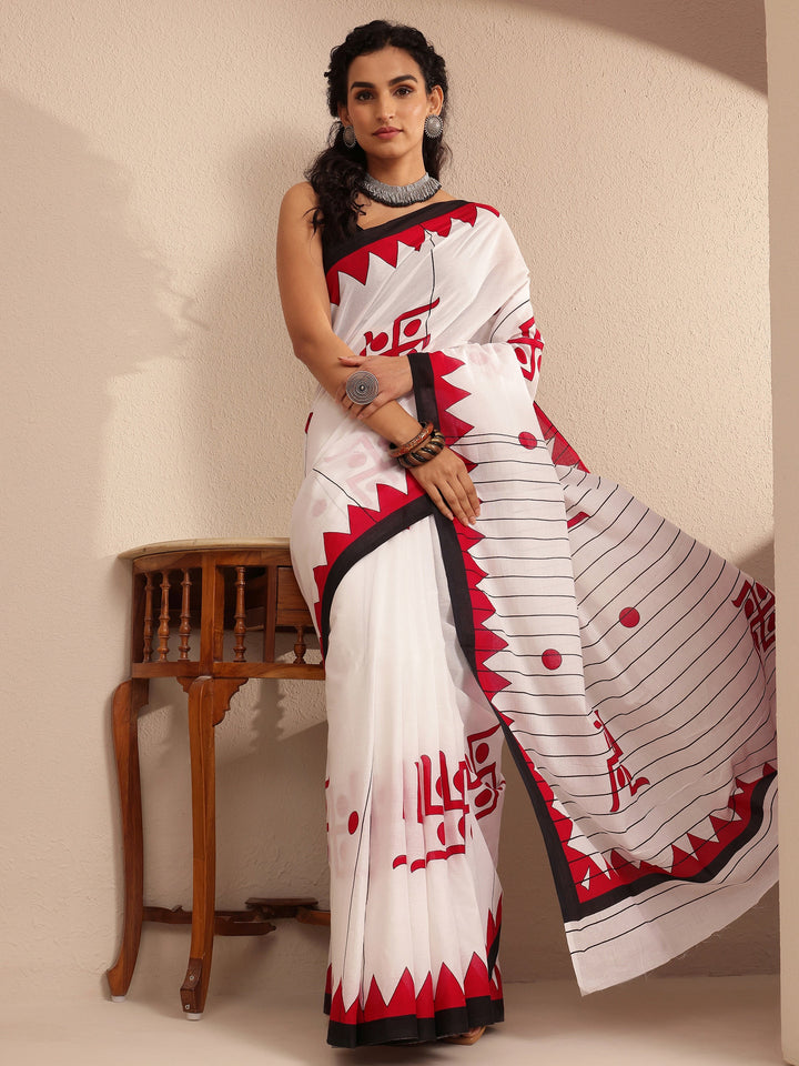 White Printed Cotton Saree With Unstitched Blouse Piece