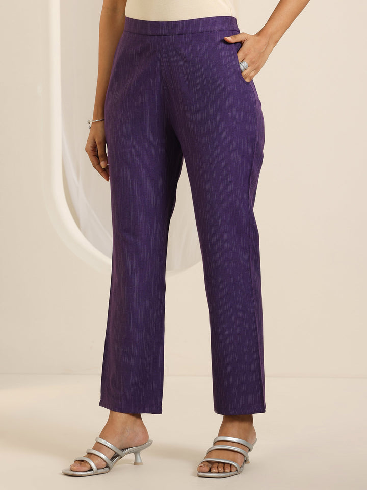 Our 3-piece purple cotton blend suit set features a straight-fit kurta with a square neckline, regular sleeves, and a statement yoke. Complemented with straight pants with an elasticated waistband and a printed dupatta. Adorned with striped self-design, this style is perfect for casual occasions.