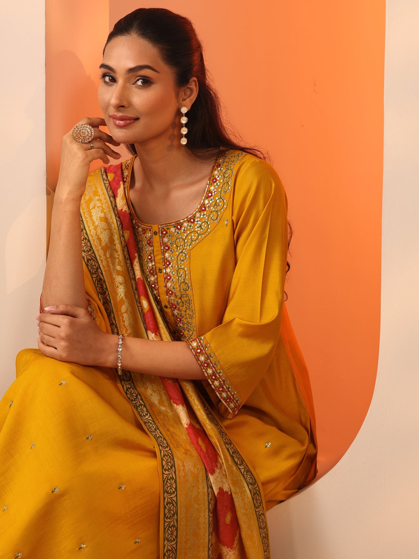 Our 3-piece Yellow Rayon Straight-fit Kurta Set features a Round Neckline, Regular Sleeves, and statement yoke. Complemented with Straight Pants with a Partially Elasticated waistband and 2 pockets, and a Printed dupatta. Adorned with zari embellished embroidery, this style is perfect for Festive occasions.