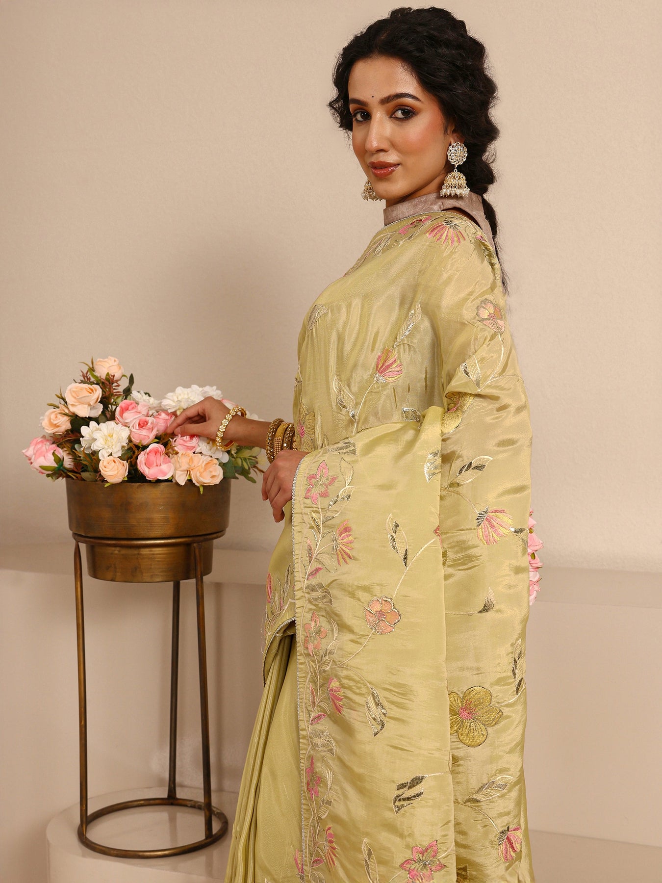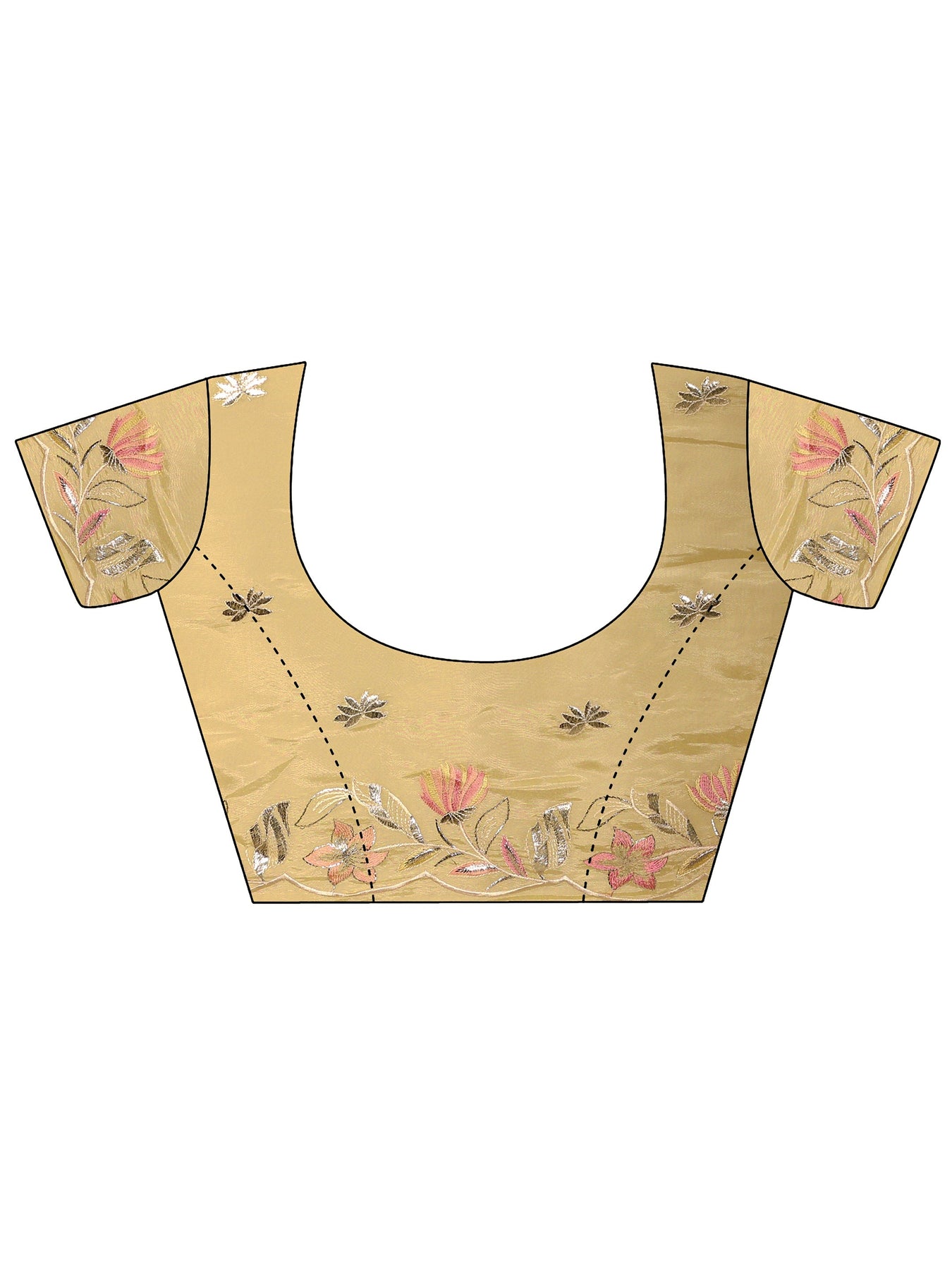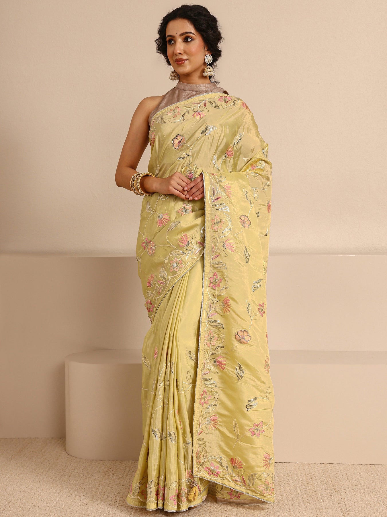 Our mustard silk-blend saree features a soft, lustrous drape adorned with delicate pink and silver floral embroidery and scattered sequin detailing. Complemented with unstitched blouse, this graceful saree is perfect for festive occasions and traditional celebrations.