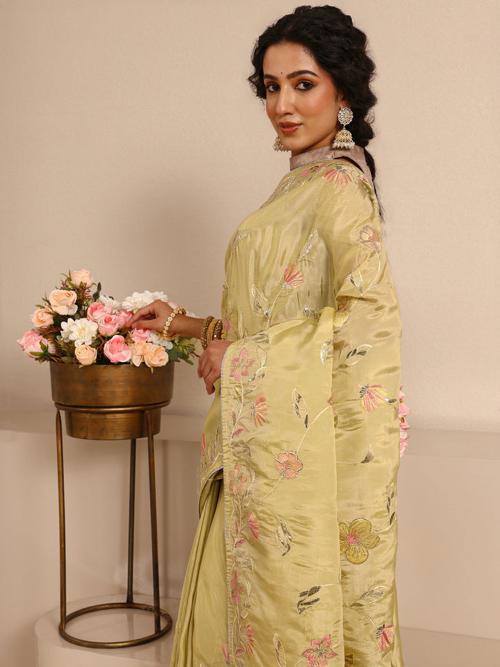 Yellow Floral Embellished Silk Blend Saree  With Unstitched Blouse Piece