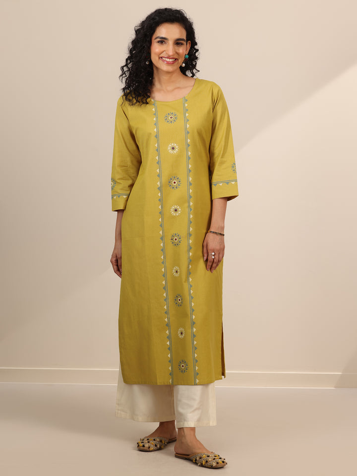 Our 1-piece yellow cotton blend straight-fit kurta features a round neckline, regular sleeves and statement Yoke. Adorned with ethnic motifs prints, this style is perfect for casual wear.