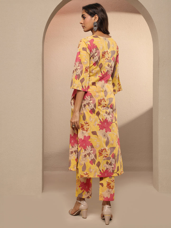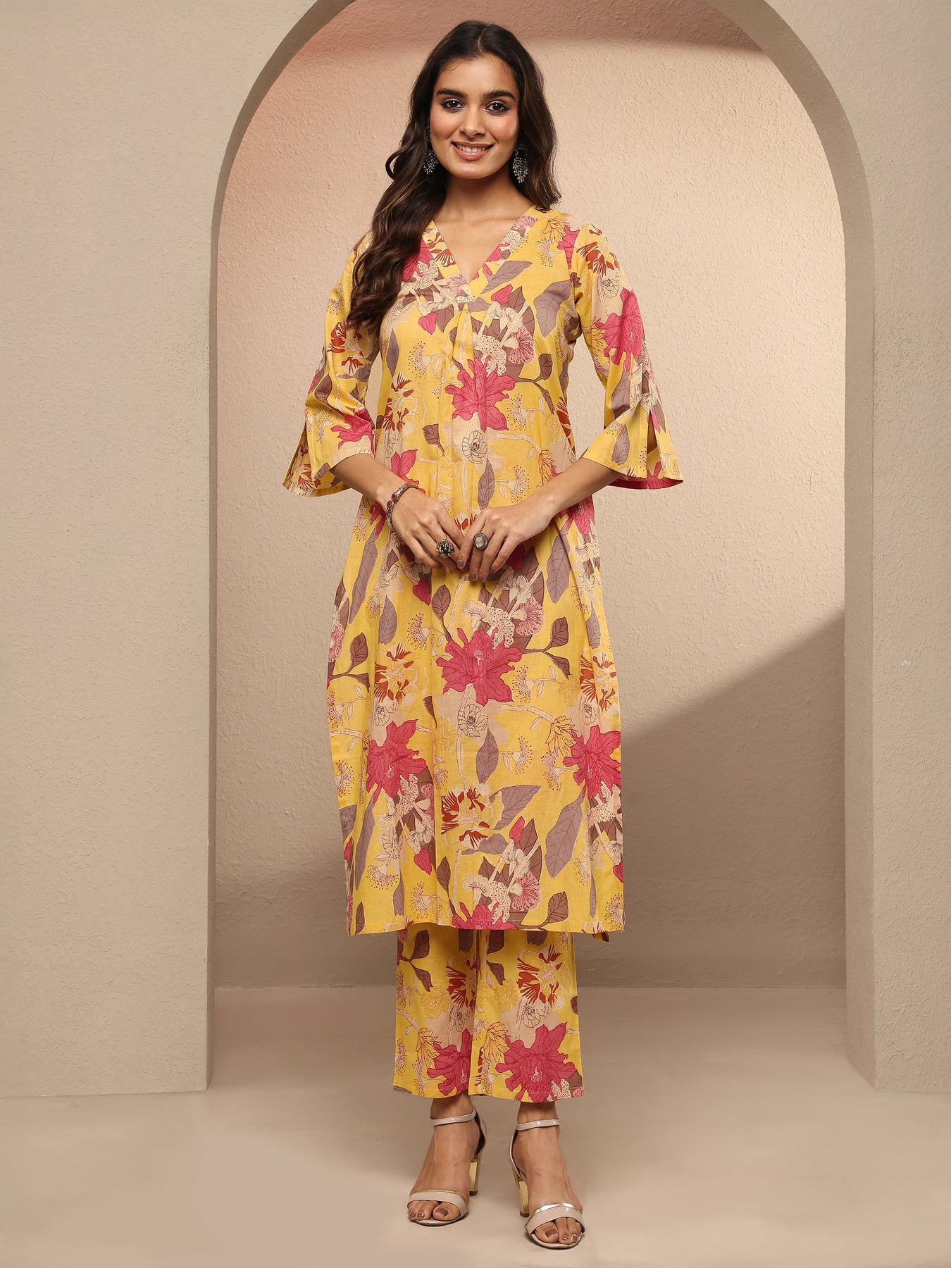 Our 2-piece yellow printed Cotton co-ord set features a Straight-fit Tunic with a V-Neck neckline and Three-quarter sleeves. Complemented with matching Palazzos with a Partially Elasticated waistband and 2 pockets. Highlighted with floral Print, this style is perfect for Festive occasions.