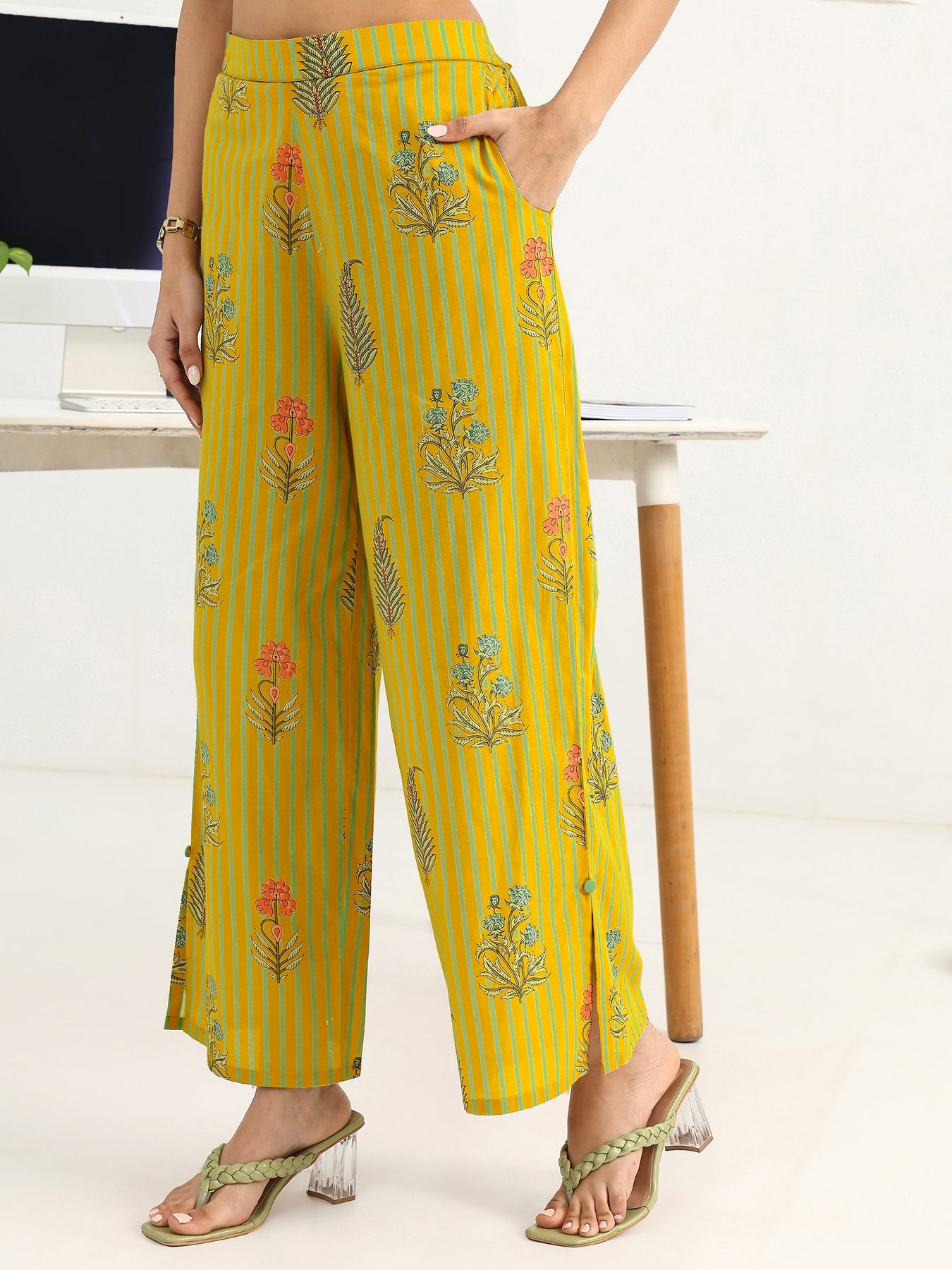Yellow Striped Printed Cotton Blend Straight Kurta Set