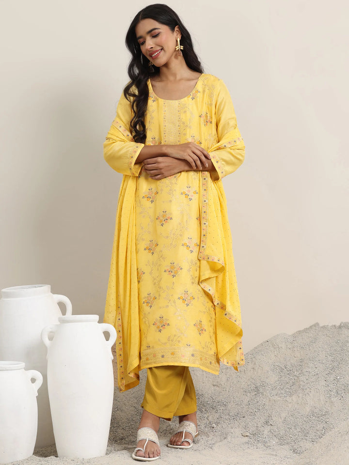 Yellow Woven Design Silk Blend Straight Suit With Dupatta