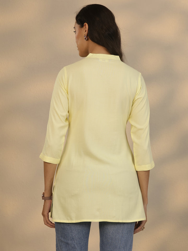 Our 1-piece yellow rayon straight-fit kurta features a U-notched neckline, regular sleeves, and statement yoke. Adorned with top print, this style is perfect for work wear and casual wear.